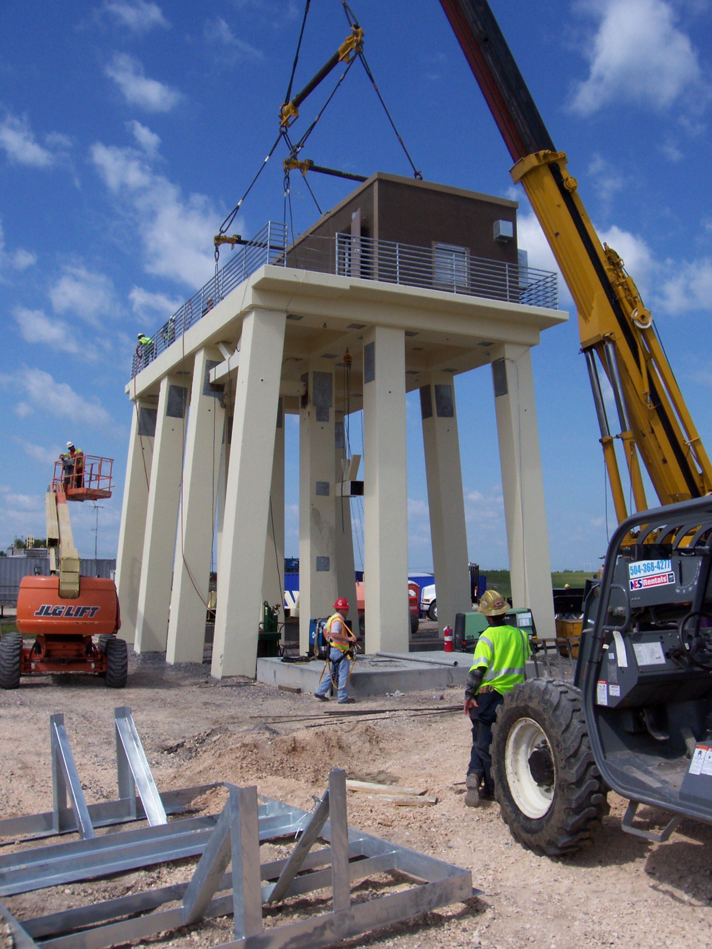 The structures consisted of concrete foundations, pre-cast concrete piles, cast-in-place concrete platforms, procurement and installation of the actual safe rooms, installation of all utilities, and installation of backup diesel fuel systems. The existing drainage pump stations were automated at all five sites while ongoing pump station operations were maintained throughout the construction period.